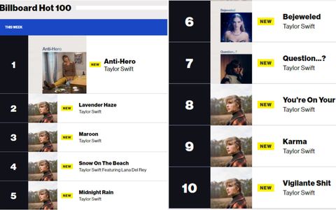 Đây là lần đầu tiên có 1 nghệ sỹ làm được điều này kể từ khi bảng xếp hạng âm nhạc Billboard ra đời. Tất cả các ca khúc này đều nằm ở trong album Midnights, là album mới nhất của cô nhạc sỹ/ca sỹ này.