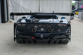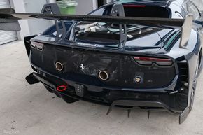 Diện tích ở cản sau phần lớn là bề mặt lưới tổ ong để tối ưu cho khả năng giải nhiệt của động cơ, hệ thống ống xả kép đặt cao cùng với Logo ở chính giữa.Khu vực bên dưới là hệ thống khí động học rất "hầm hố" và cũng rất phức tạp.Đối với xe đua, hệ thống khuếch tán khí động học này quan trọng và vai trò tương đương với cánh gió phía sau. Hệ thống phức tạp này hoạt động dựa trên nguyên lý Bernoulli, khi tốc độ không khí tăng ở dưới gầm sẽ làm áp suất giảm, bộ khuếch tán gió sẽ làm chậm và khuếch tán luồng không khí này ra ngoài môi trường với áp suất cao hơn, tạo ra một lực hút kéo toàn bộ gầm xe và thân xe xuống mặt đường (downforce).