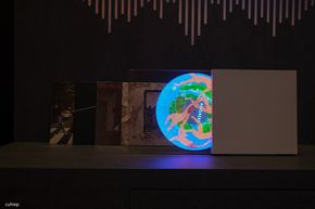 Khu vực Art Store được thiết kế như một không gian triển lãm nghệ thuật số. Samsung đã kết hợp 3 chiếc TV mẫu R95H 85 inch cùng với 7 máy chiếu để tạo ra một không gian hình ảnh 360 độ bao trùm người mình luôn. Với viền màn hình siêu mỏng, ranh giới giữa các thiết bị gần như bị xóa nhòa, khiến mình cảm giác như đang đứng giữa một bức tranh toàn cảnh sống động.