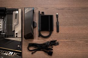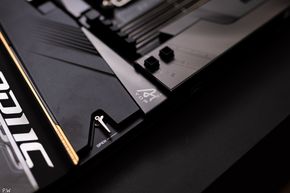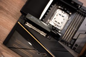 Còn ở cạnh bên của bo mạch chủ, chính là một cổng USB-C với khả năng cấp nguồn 65W Quick Charge, và một cổng USB-C 10 Gbit để đưa kết nối ra mặt trước của thùng máy. Và khi nói tới cạnh bên, mọi kết nối và cổng cấp nguồn đều nằm ở cạnh sườn của bo mạch chủ, chứ không phải trên mặt trước. Nhờ đó, giấu cáp dễ hơn. Nhưng vì là một bo mạch chủ thiết kế EATX, nên cũng sẽ cần một thùng máy rộng rãi về không gian để dễ dàng đi dây.