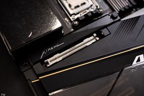 Giữa socket AM5 và khe cắm PCIe chính của bo mạch, là một khe cắm SSD NVMe PCIe 5.0. Sẽ có hai lựa chọn tản nhiệt. SSD PCIe 4.0 lắp vào đây thì dùng miếng tản nhiệt mỏng là ổn, nhưng nếu dùng SSD PCIe Gen 5, sẽ cần tới tản nhiệt chủ động, to chẳng kém gì mấy cái capture card hay wifi card mình hay xài cả: