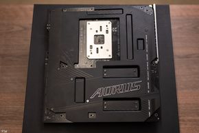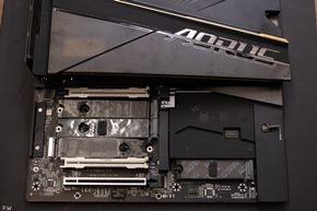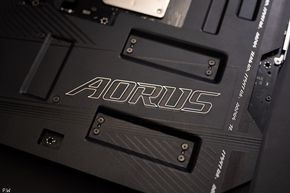 Lật mặt sau, sẽ thấy Gigabyte không giản tiện bất kỳ chi tiết nào cả. Nguyên mặt sau là một miếng thép gia cố để bo mạch vừa không bị biến dạng trong quá trình sử dụng, lắp nhiều linh kiện trọng lượng nặng, vừa tối ưu làm mát cho toàn bộ hệ thống: