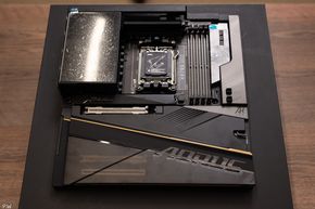 Mở ngăn đầu tiên, anh em sẽ được chiêm ngưỡng chiếc bo mạch chủ ở dáng vẻ cơ bản nhất của nó. Chưa có tản nhiệt chủ động cho SSD PCIe Gen 5, cũng chưa có miếng nhựa mờ che mấy thanh RAM, kèm thêm cả quạt tản nhiệt cho RAM nữa.