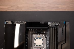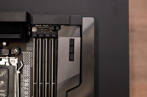 Hai chỗ dán film bảo vệ chống xước, bên trái là màn hình Edge View như anh em đã thấy trong những tấm hình lên dàn máy, còn bên phải là một tấm gương hít nam châm, giúp tăng độ phản chiếu của đèn RGB từ mấy thanh RAM. Rồi ngay cạnh đó là 4 khe RAM bọc lớp vỏ thép, với tốc độ tối đa hỗ trợ những thanh RAM 9000 MT/s.