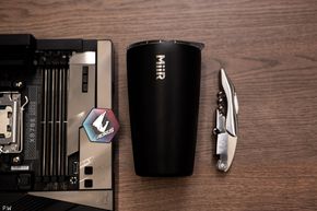 Cuối cùng là mấy món phụ kiện, từ dây cáp dẫn nguồn và điều khiển dèn RGB, tới cáp SATA nếu cần lắp thêm HDD lưu trữ. Hai món tản nhiệt SSD chủ động và tấm che RAM mình đã đề cập ở trên, và có thêm ăng ten WiFi 7 tháo lắp dễ dàng nữa. Nhưng có lẽ bất ngờ nhất, là vì một lý do gì đó, mua chiếc bo mạch chủ 35 triệu Đồng này về, Gigabyte tặng anh em thêm… một cái ly giữ nhiệt và một bộ đồ khui nút bấc chai rượu vang (!?)