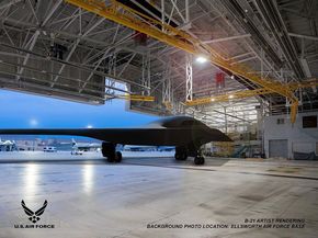 Hình ảnh render được Bộ tư lệnh không kích toàn cầu thuộc Không lực Hoa Kỳ chia sẻ trên Facebook cho thấy chiếc B-21 đậu trong hangar của 3 căn cứ không quân gồm Dyess, Ellsworth và Whiteman. Các mảng sáng tối khiến nhiều chi tiết quan trọng của chiếc máy bày này không lộ ra nhưng các nhà phân tích đến từ The War Zone đã đưa ra những dự đoán như sau: