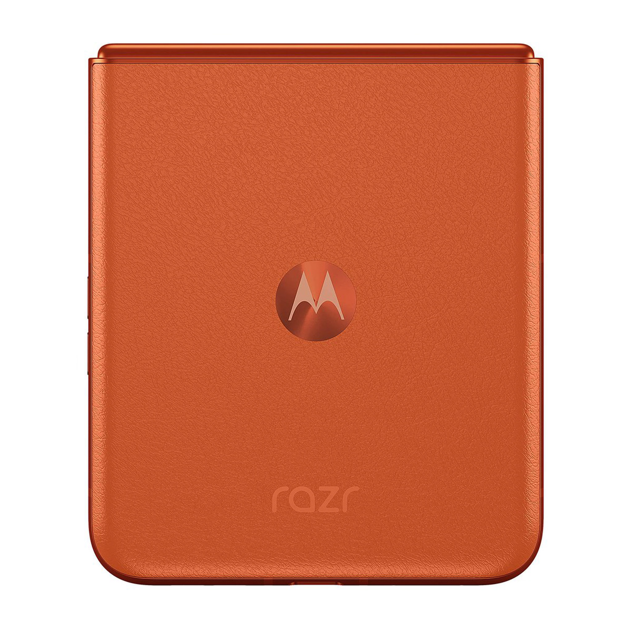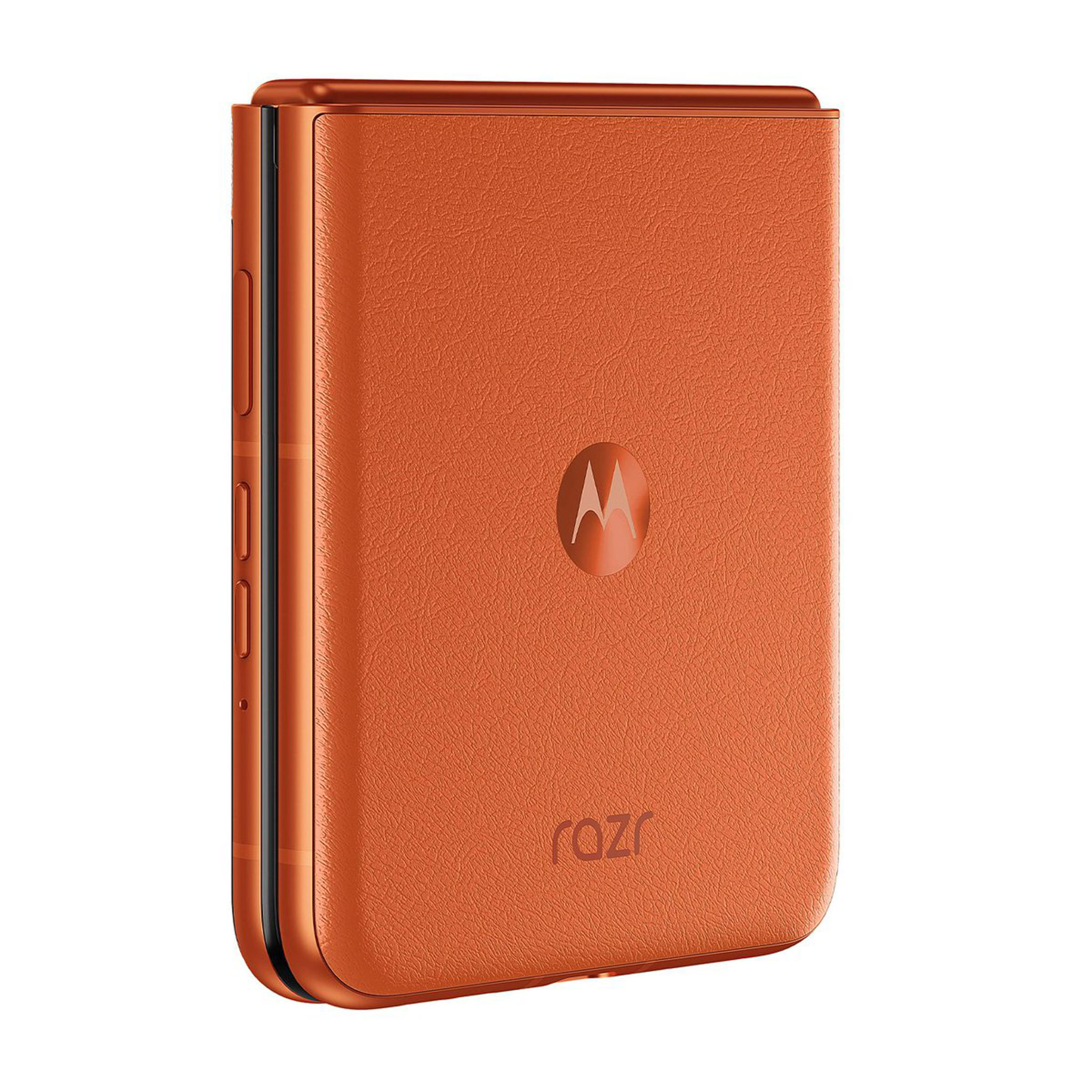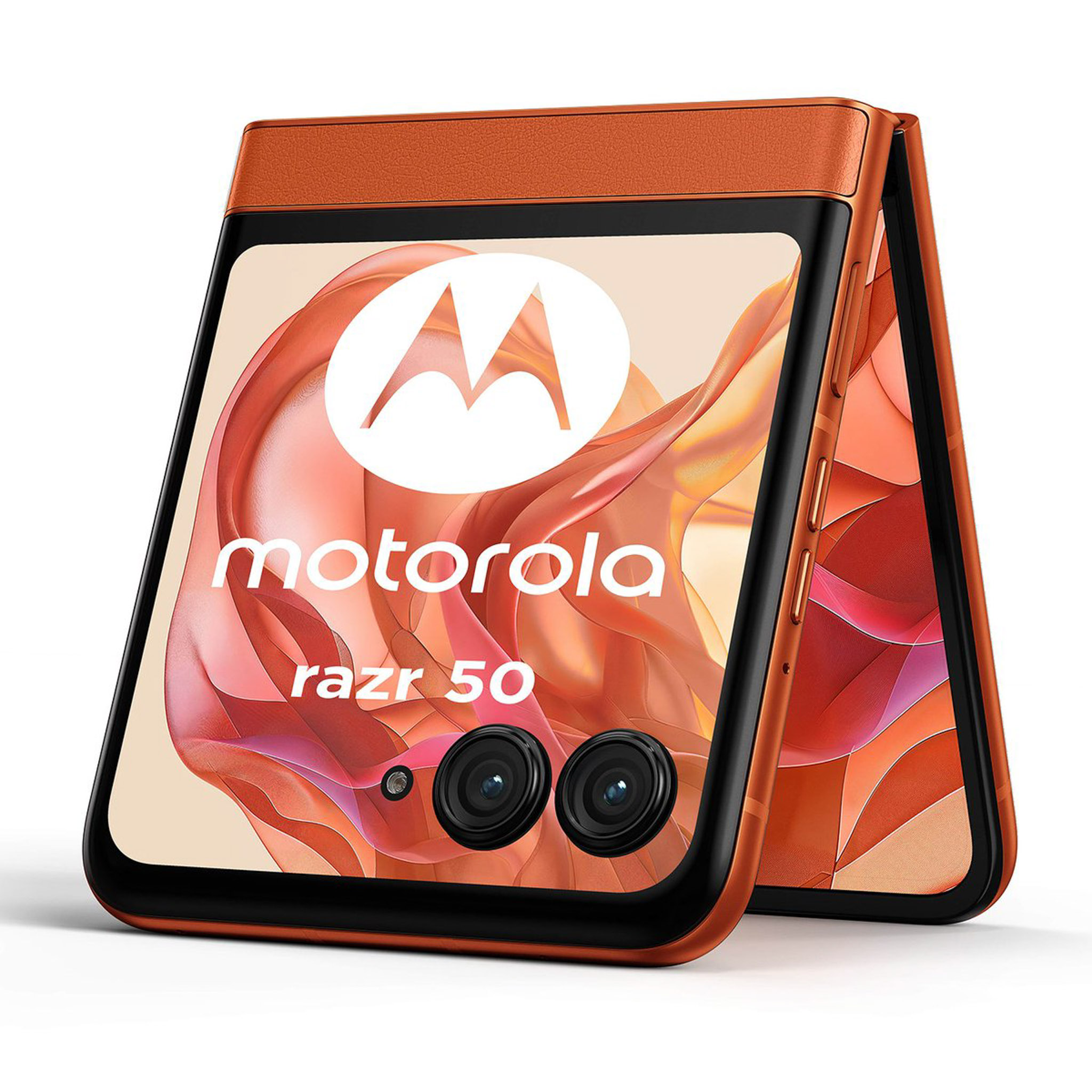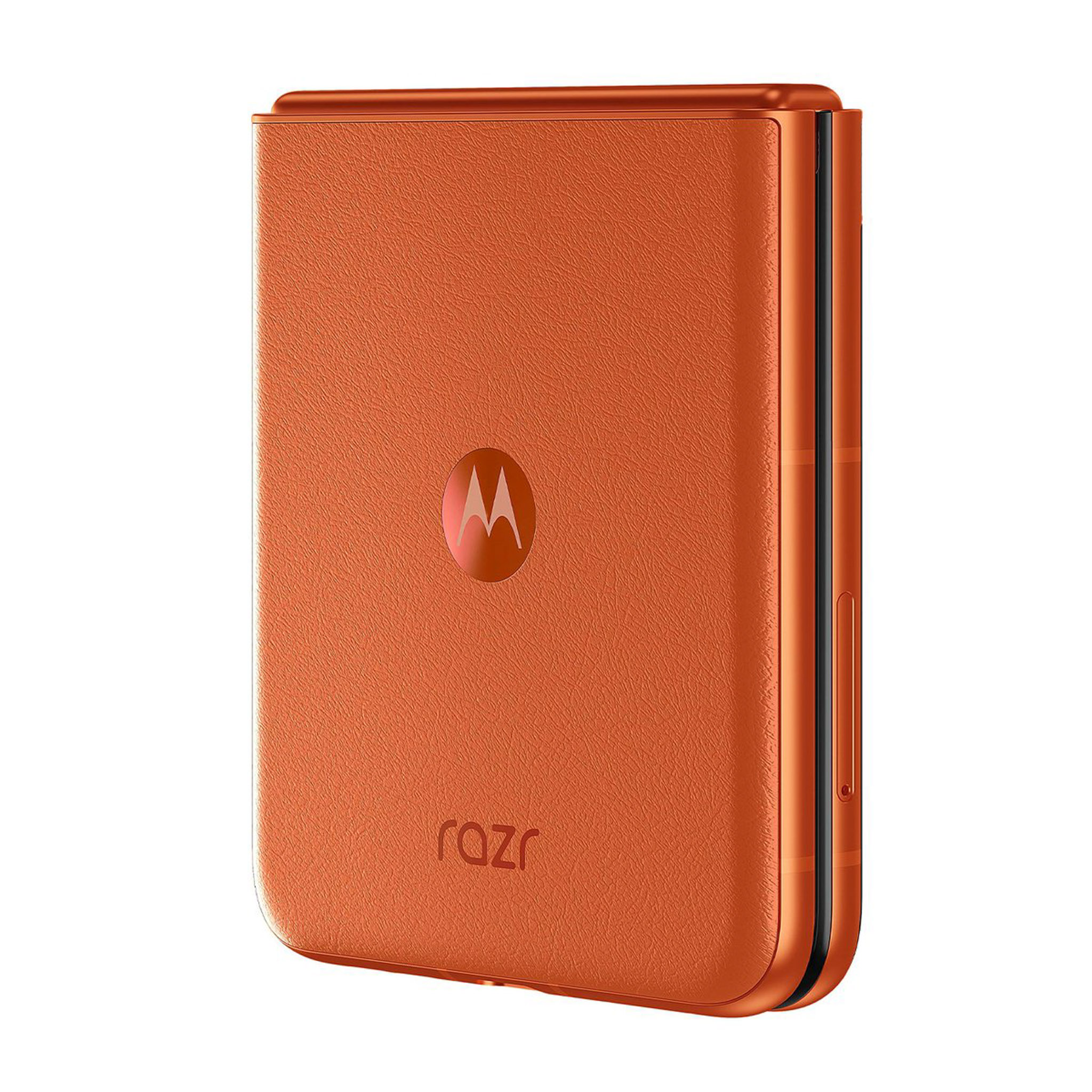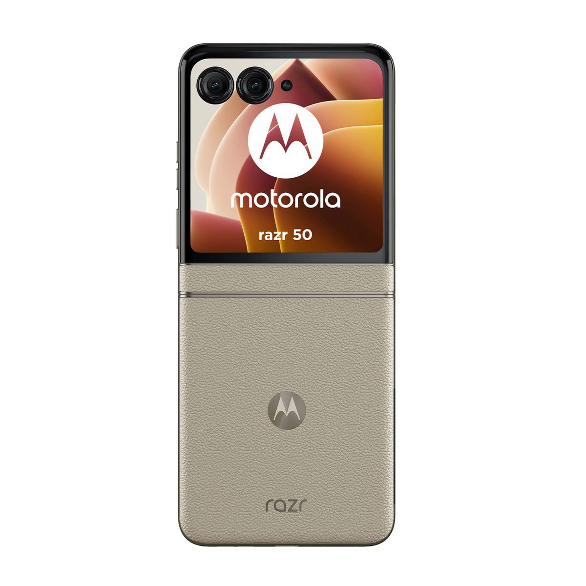 Những hình ảnh về motorola moto razr 50 bao gồm 3 tùy chọn màu sắc (theo thứ tự từ trái sang phải) là cam (mặt lưng hoa văn nổi), xám (mặt lưng kính nhám), beige (mặt lưng da). Nguồn: motorola.