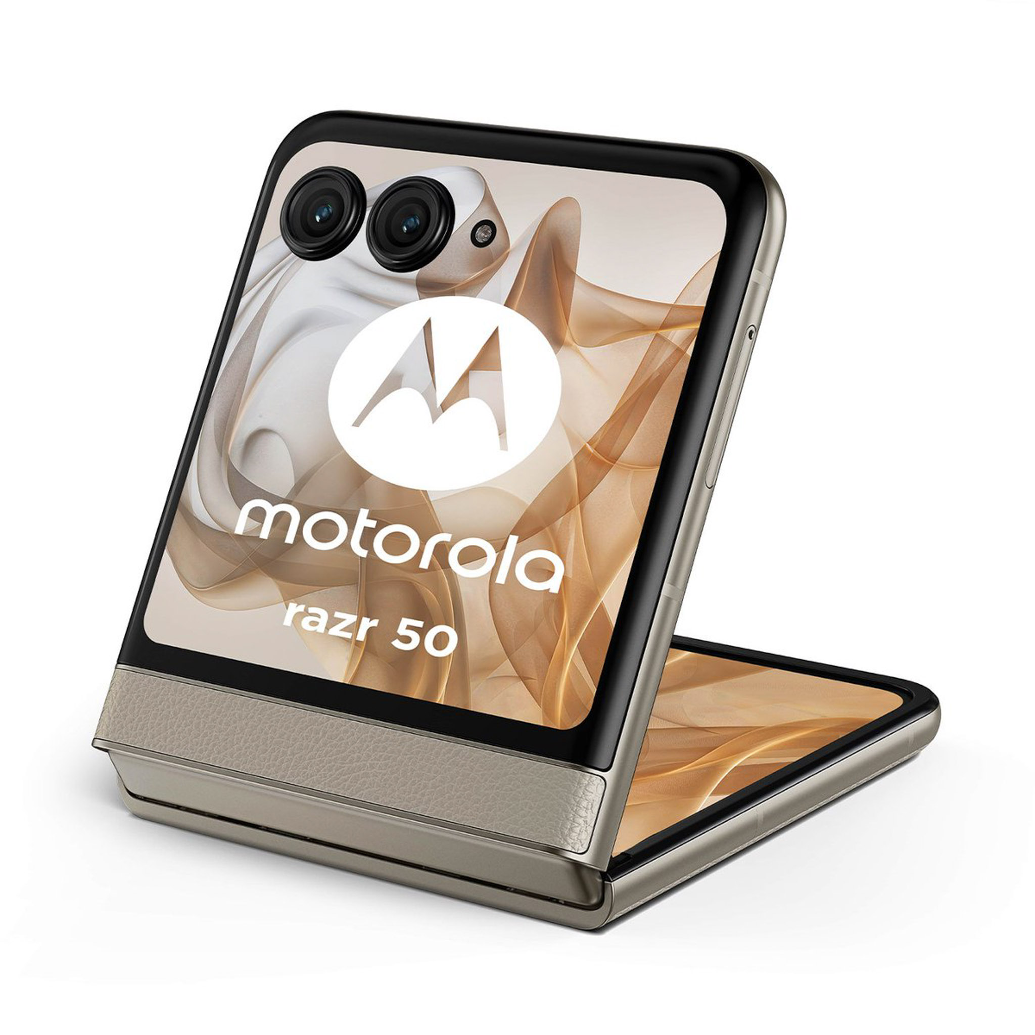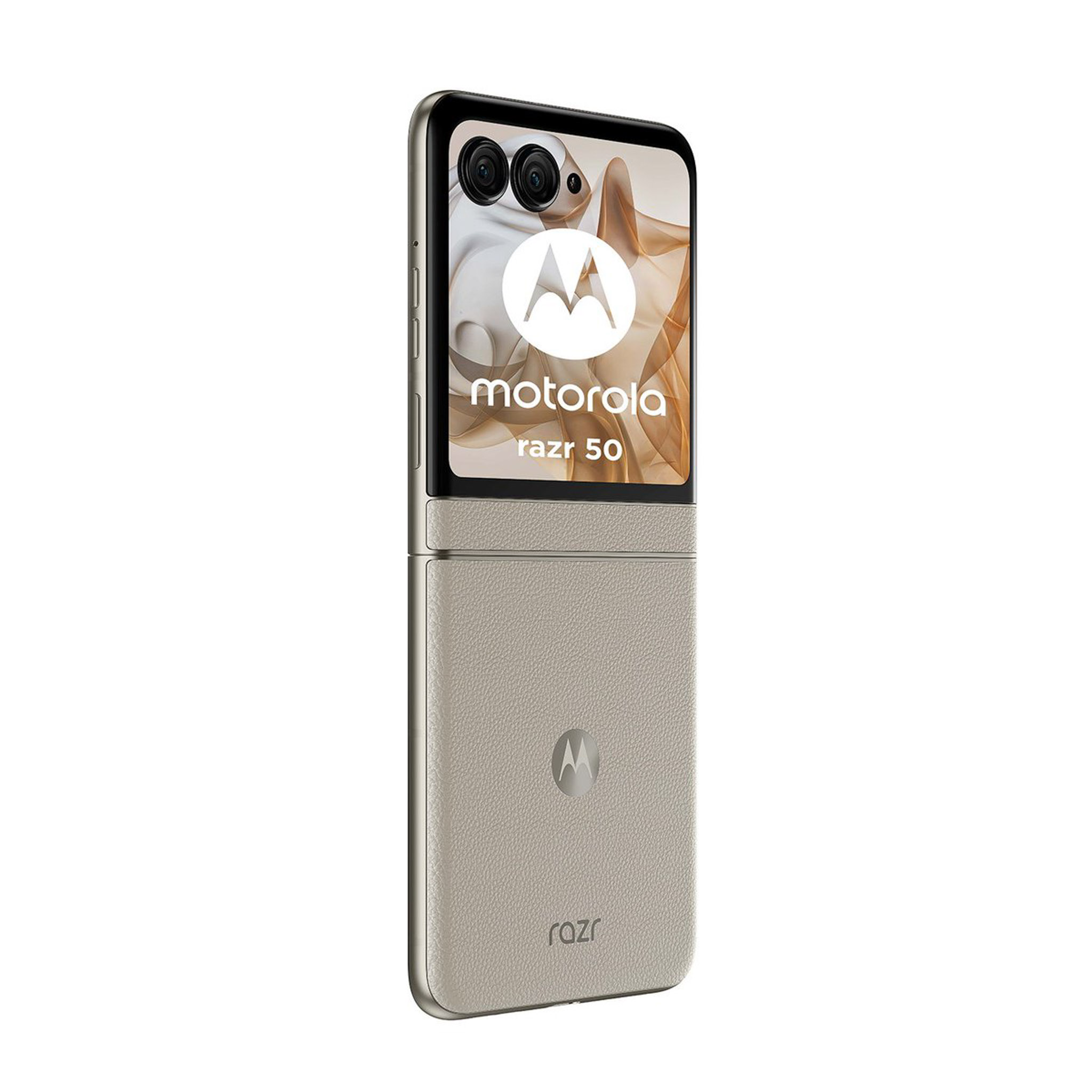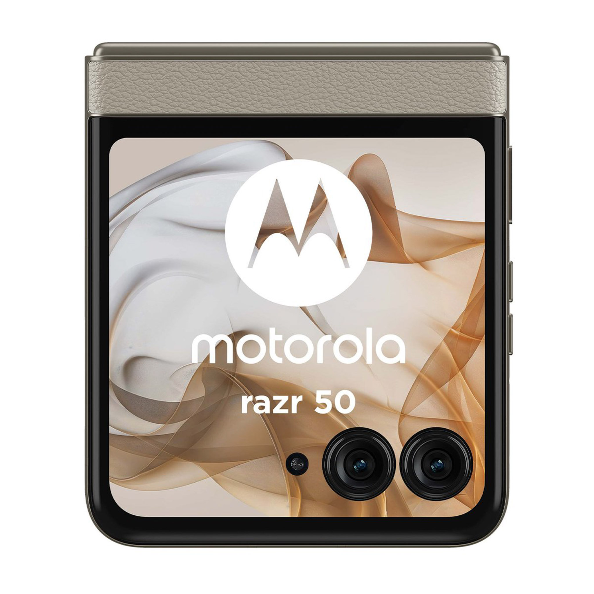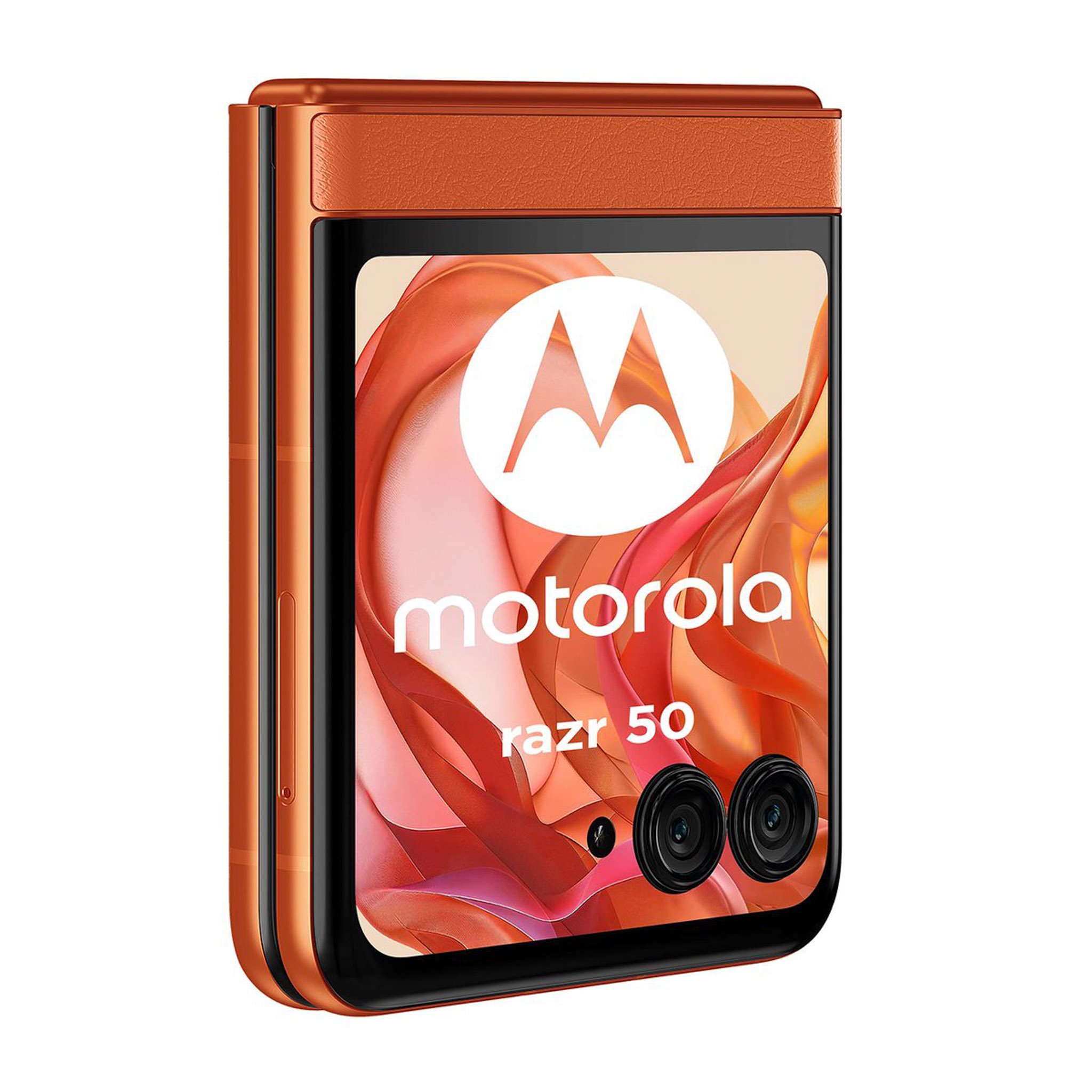 Những hình ảnh về motorola moto razr 50 bao gồm 3 tùy chọn màu sắc (theo thứ tự từ trái sang phải) là cam (mặt lưng hoa văn nổi), xám (mặt lưng kính nhám), beige (mặt lưng da). Nguồn: motorola.