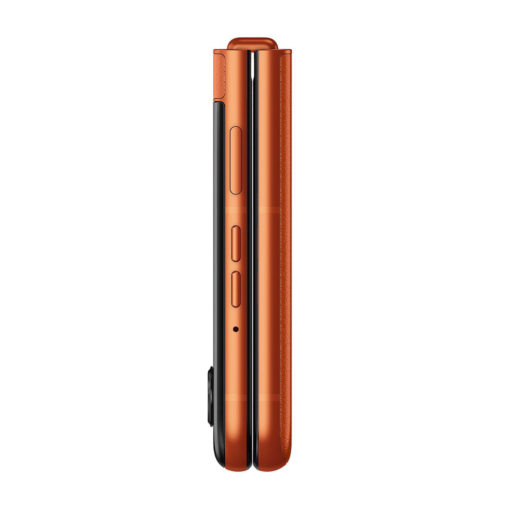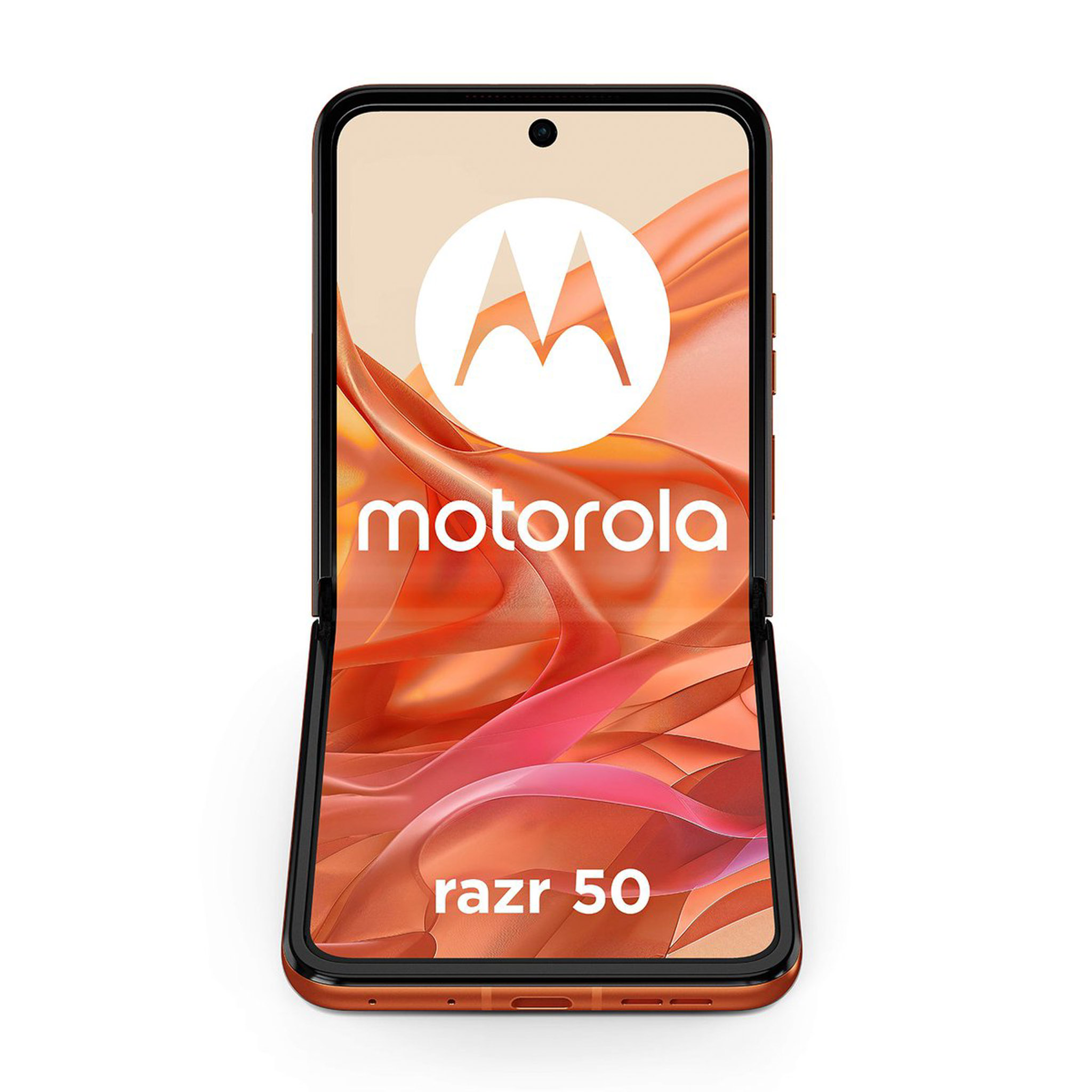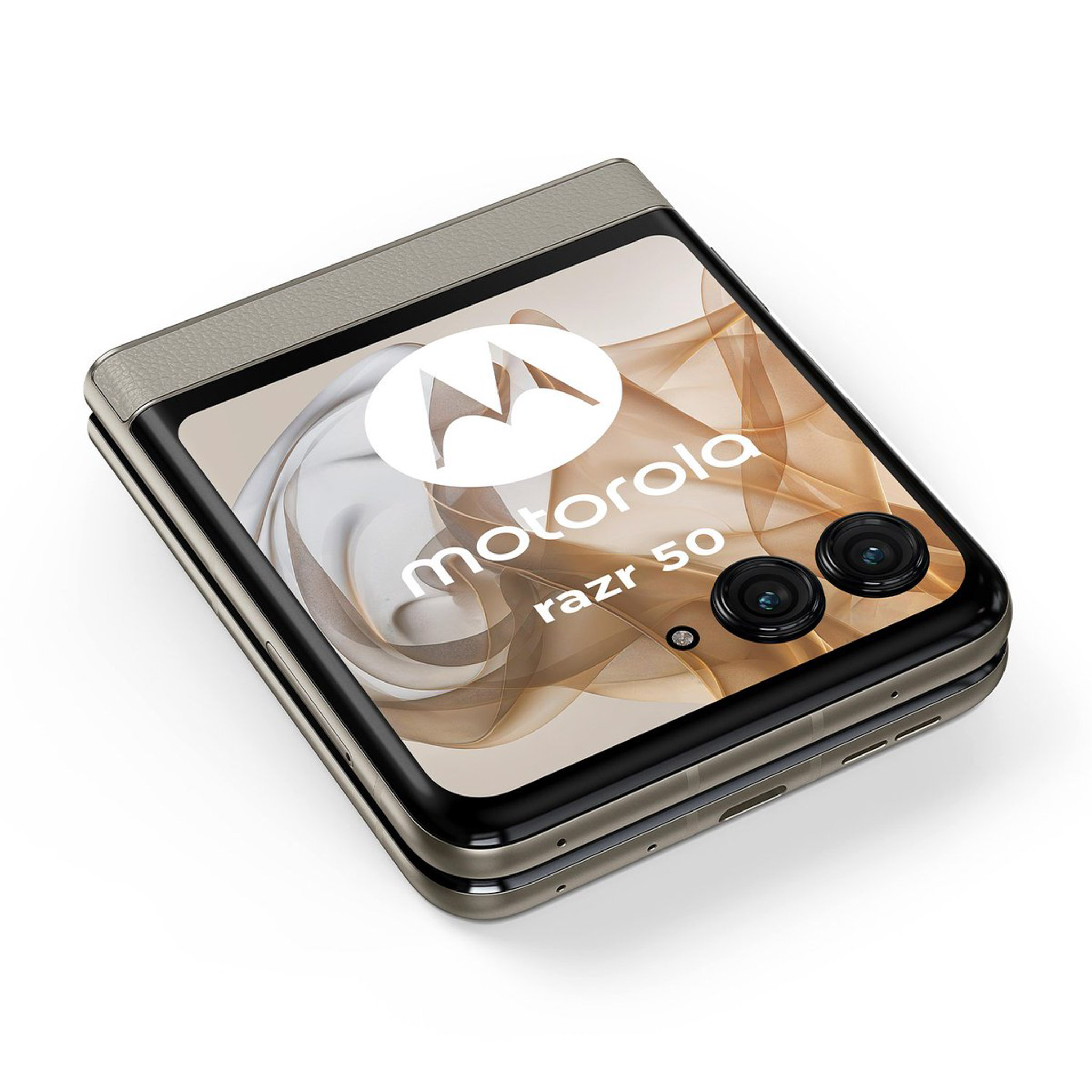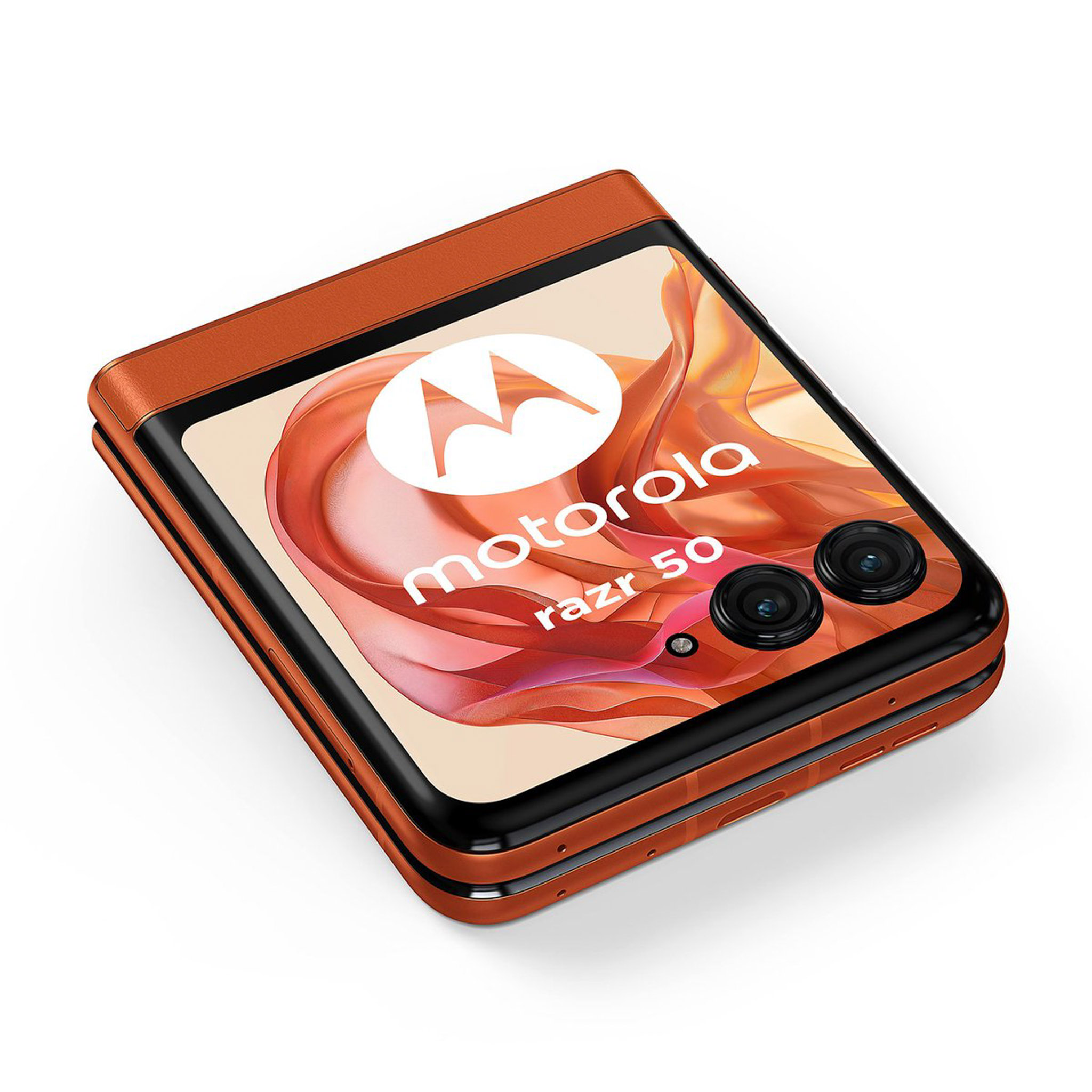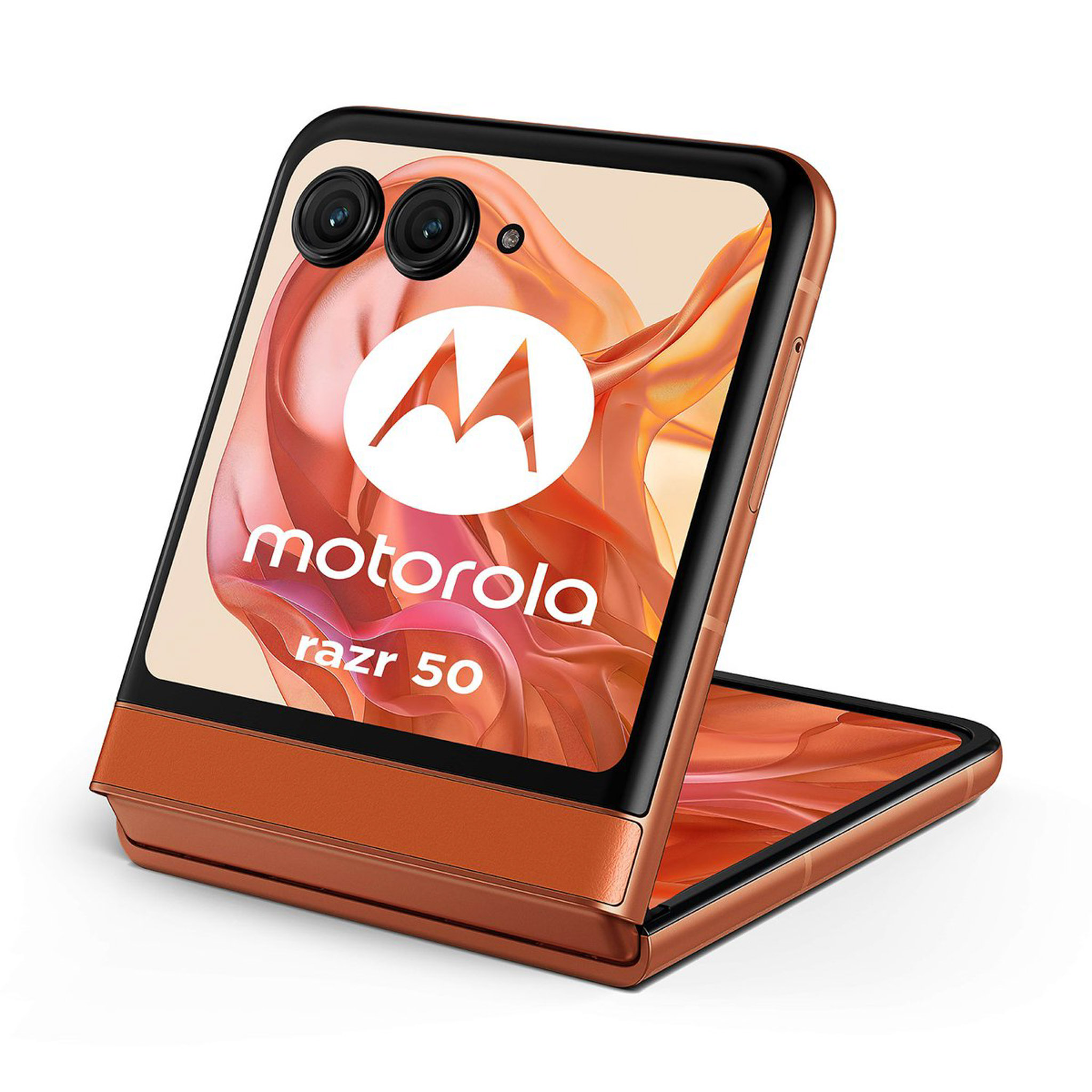 Những hình ảnh về motorola moto razr 50 bao gồm 3 tùy chọn màu sắc (theo thứ tự từ trái sang phải) là cam (mặt lưng hoa văn nổi), xám (mặt lưng kính nhám), beige (mặt lưng da). Nguồn: motorola.
