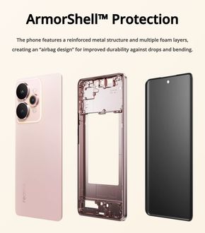 realme 15 Pro 5G cũng sở hữu độ bền ấn tượng nhờ vào việc được trang bị cấu trúc ArmorShell Protection với lớp kim loại cùng nhiều lớp đệm mút tạo ra “airbag design” (tạm dịch: thiết kế túi khí). Điều này giúp thiết bị sống sót sau những cú va đập.
