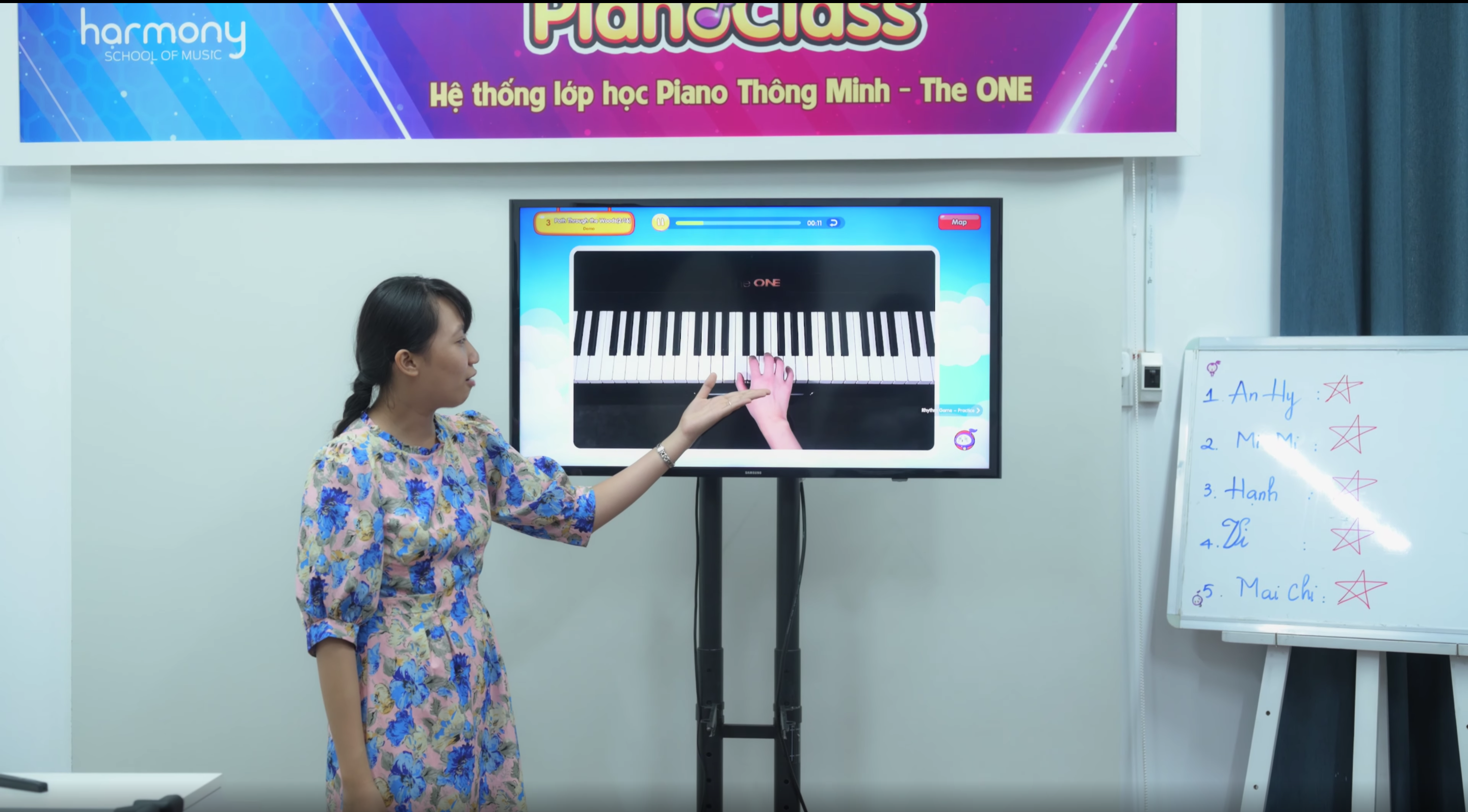 - Một giáo viên đứng lớp hướng dẫn và theo dõi học viên vừa thông qua số liệu thể hiện trong hệ thống để biết được chính xác bé nào đánh như thế nào, đúng cao độ, trường độ, nhịp hay chưa và vừa quan sát trực tiếp các bé tại lớp để điều chỉnh giám sát sự tập trung, cách đặt tay, tư thế ngồi, hỗ trợ bé khi cần.