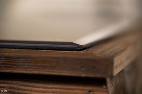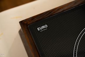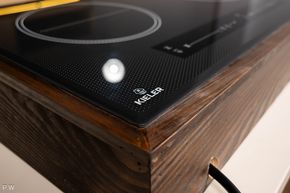 Để mô phỏng phần nào công năng của KL 301 Pro, mình có nhờ Vương DIY làm một bệ gỗ với đúng kích thước lỗ đục trên đây, đặt chiếc bếp vào là vừa khít. Độ dày của mặt kính cường lực, với bốn cạnh viền được mài vát, vừa tăng tính thẩm mỹ vừa đảm bảo an toàn không cứa vào tay người dùng, trông như thế này: