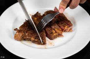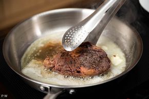 Đấy là mua mấy miếng bò về, làm steak theo kiểu “basting”, hiểu đơn giản là áp chảo các mặt miếng bò đã nêm tiêu và muối trước trên lửa lớn, rồi thả bơ, lá hương thảo, lá cỏ xạ hương và một củ tỏi nguyên vào chảo, giảm nhẹ nhiệt trên bếp và nấu cho chín đều, tùy gu để điều chỉnh thời gian nấu tương ứng, medium rare chẳng hạn.