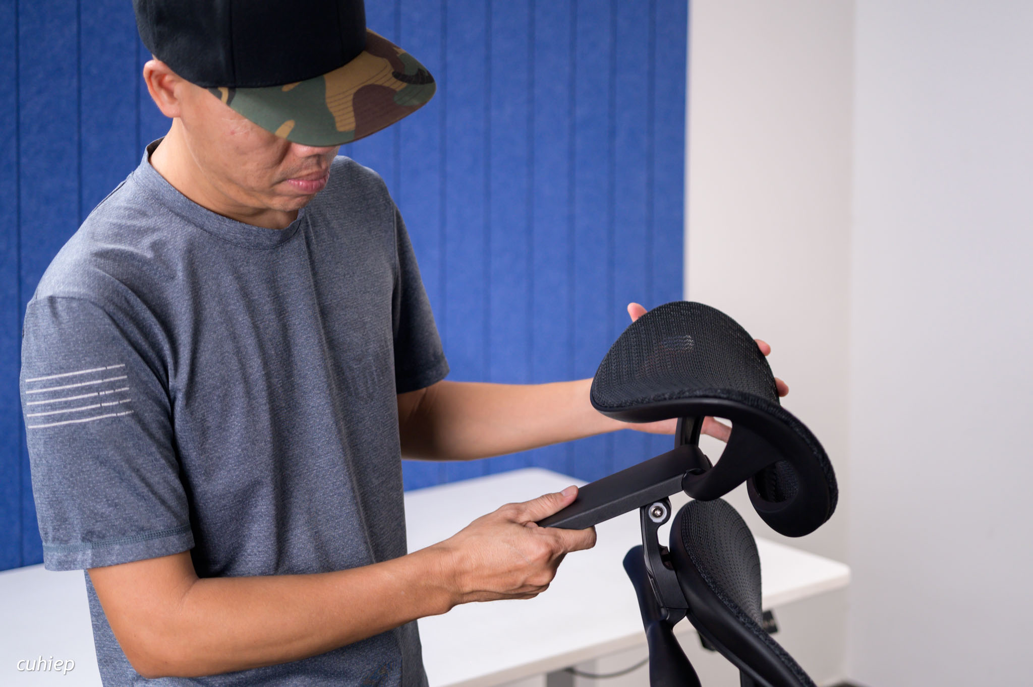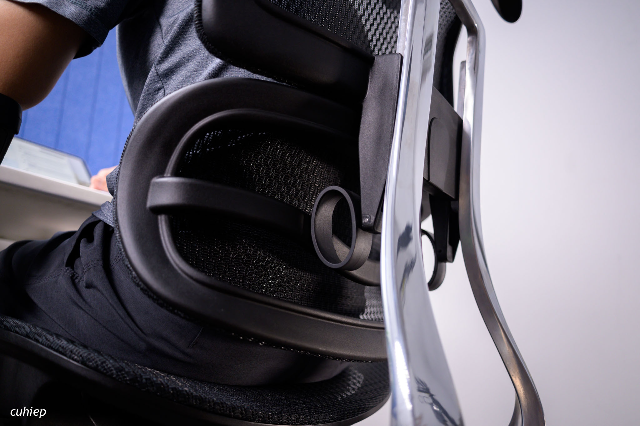 Tay ghế sẽ đỡ tay của anh em, làm cho việc để nó thoải mái không tì lên bàn, không làm cho vai bị đẩy lên. Cho nên việc tay ghế thay đổi được chiều cao và xoay được nhiều vị trí giúp cho tay ghế đỡ tay anh em khớp hơn, đúng hơn. Tức là anh em sẽ tìm được một vị trí phù hợp với anh em nhất.